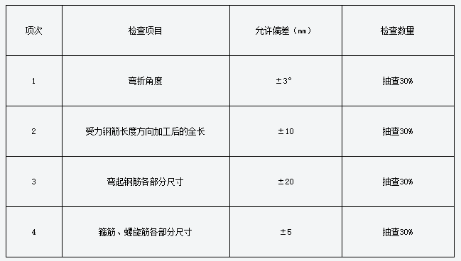 (一)對彎折鋼筋應(yīng)按每工作班同一類型鋼筋、同一加工設(shè)備為一批次進(jìn)行抽檢彎折角度和加工尺寸的檢測,每個檢查項(xiàng)目抽檢合格率均不得低于95%,否則應(yīng)予以返工處理。鋼筋彎折角度和加工尺寸允許偏差及應(yīng)檢查數(shù)量見下表。